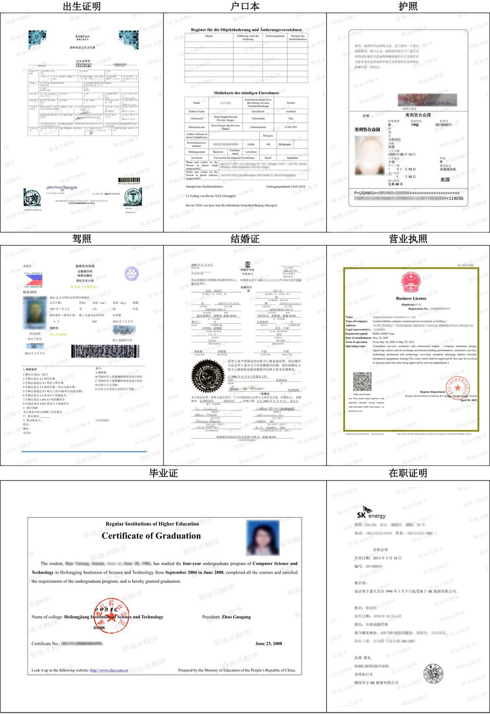 身份證、居住證、暫住證、護照、出生證、出生證明、戶口簿、戶口本、戶籍藤本、曾用名公證、單身證明、婚姻證明、已婚證明、未婚證明、結婚證、離婚證、懷孕證明、妊娠證明、健康證、預防接種證、國籍公證、證件簽章公證、駕駛執照、國際駕照、簽證、大使館簽證、出國簽證、簽證材料、旅游簽證、探親簽證、出境簽證、入境簽證、出入境簽證、入出境簽證、再入境簽證、過境簽證、外交簽證、公務簽證、移民簽證等 |