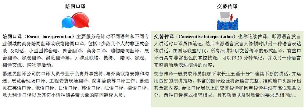 慕迪靈翻譯人員在商務(wù)陪同或旅游陪同時進行外語和漢語間的翻譯工作;在國家機關(guān)、學校、涉外單位、外資企業(yè)等各類企事業(yè)單位的各類外事活動中提供陪同口譯服務(wù),進行商務(wù)訪問接待、外事訪問接待,日常生活交流中的陪同口譯工作;進行旅游陪同,提供口譯服務(wù),使外國游客了解名勝古跡的歷史、人文資源等。
